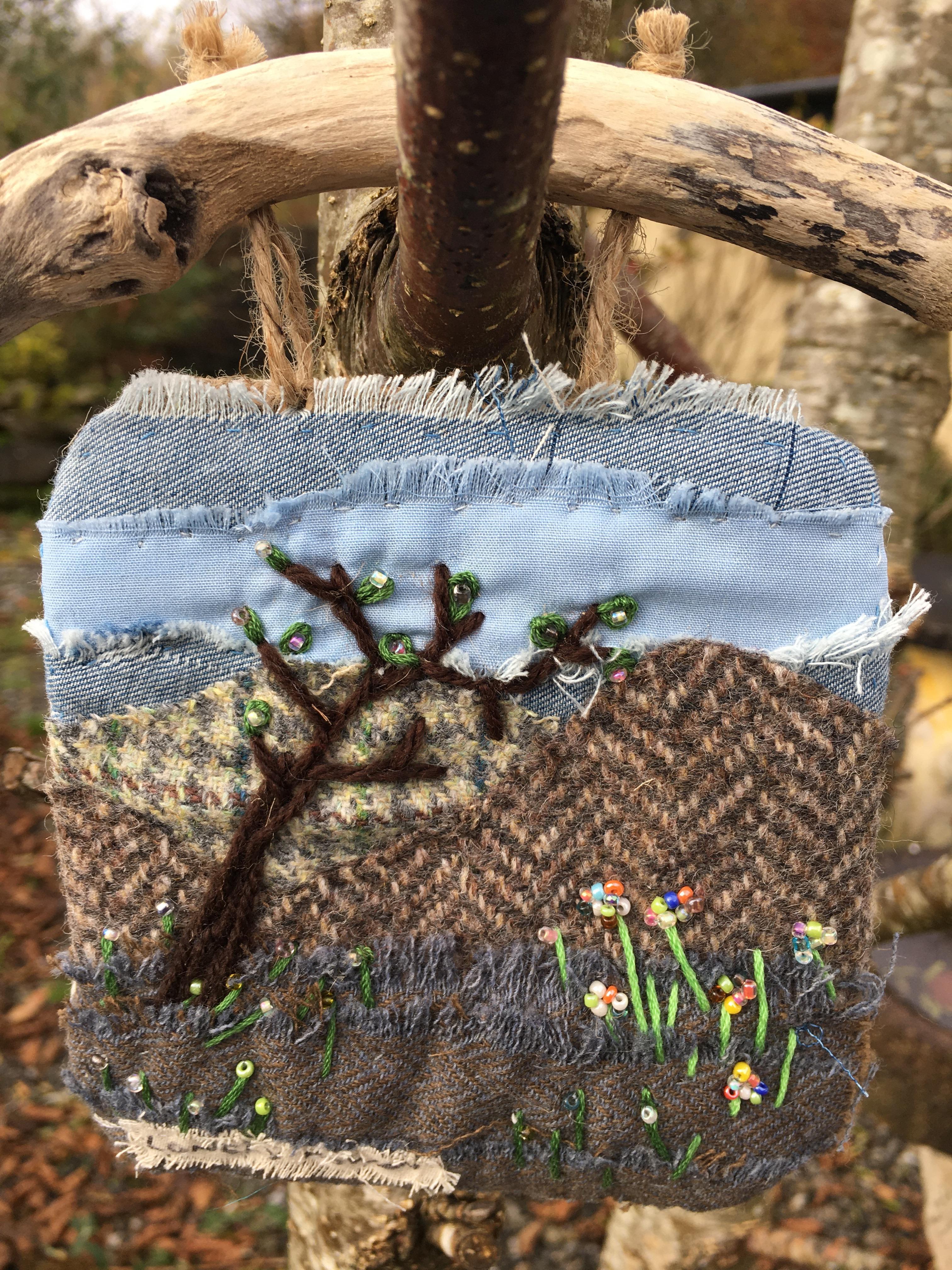 made using recycled fabrics and wools. The scene is hand stitched