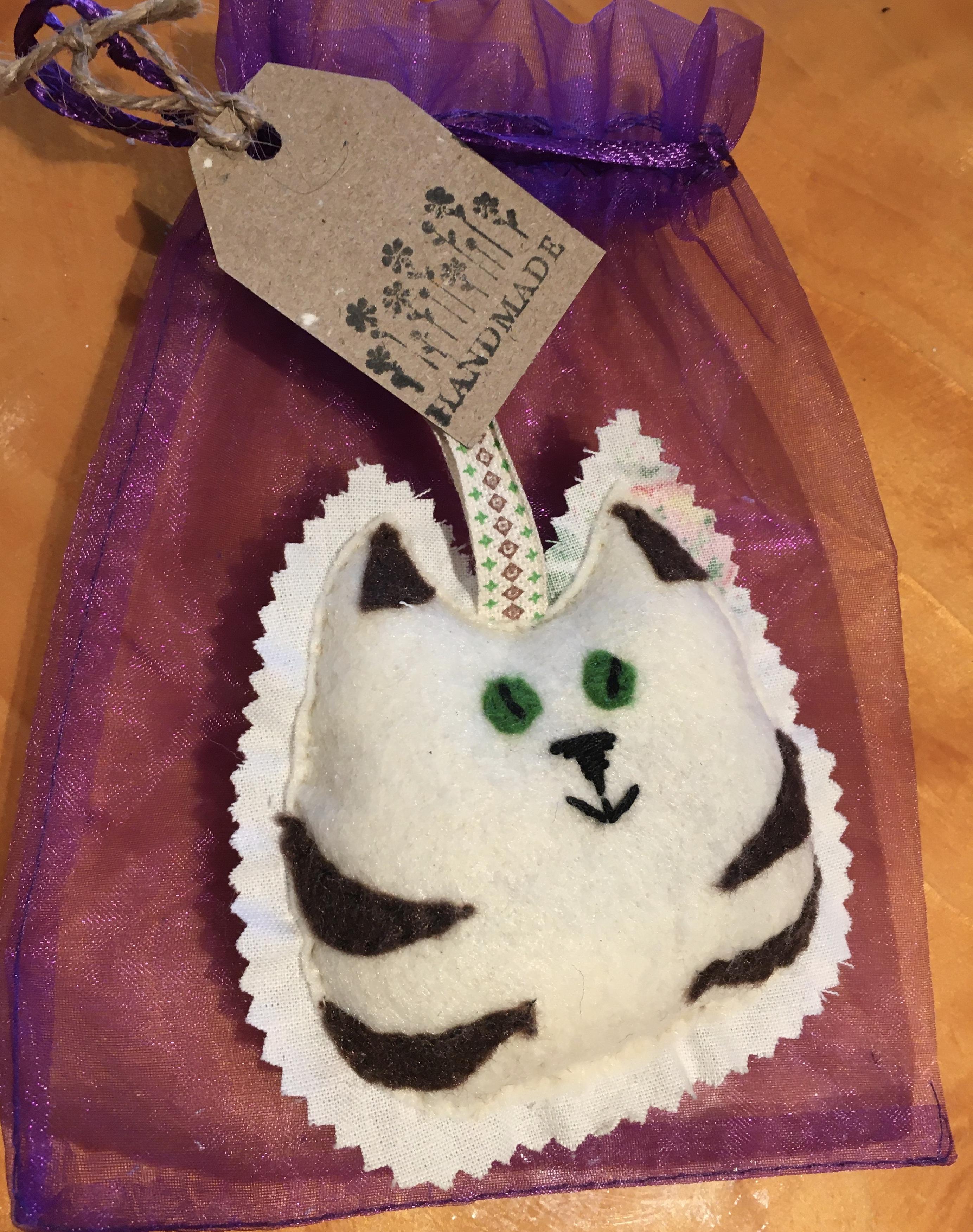 A sweet little wardrobe scenter, that could actually be hung anywhere, it has a fabric back, and a felt front, inside it has ample lavender that can be rejuvenated just by squeezing, there is a ribbon hanger, and it comes with it's own organza gift bag.