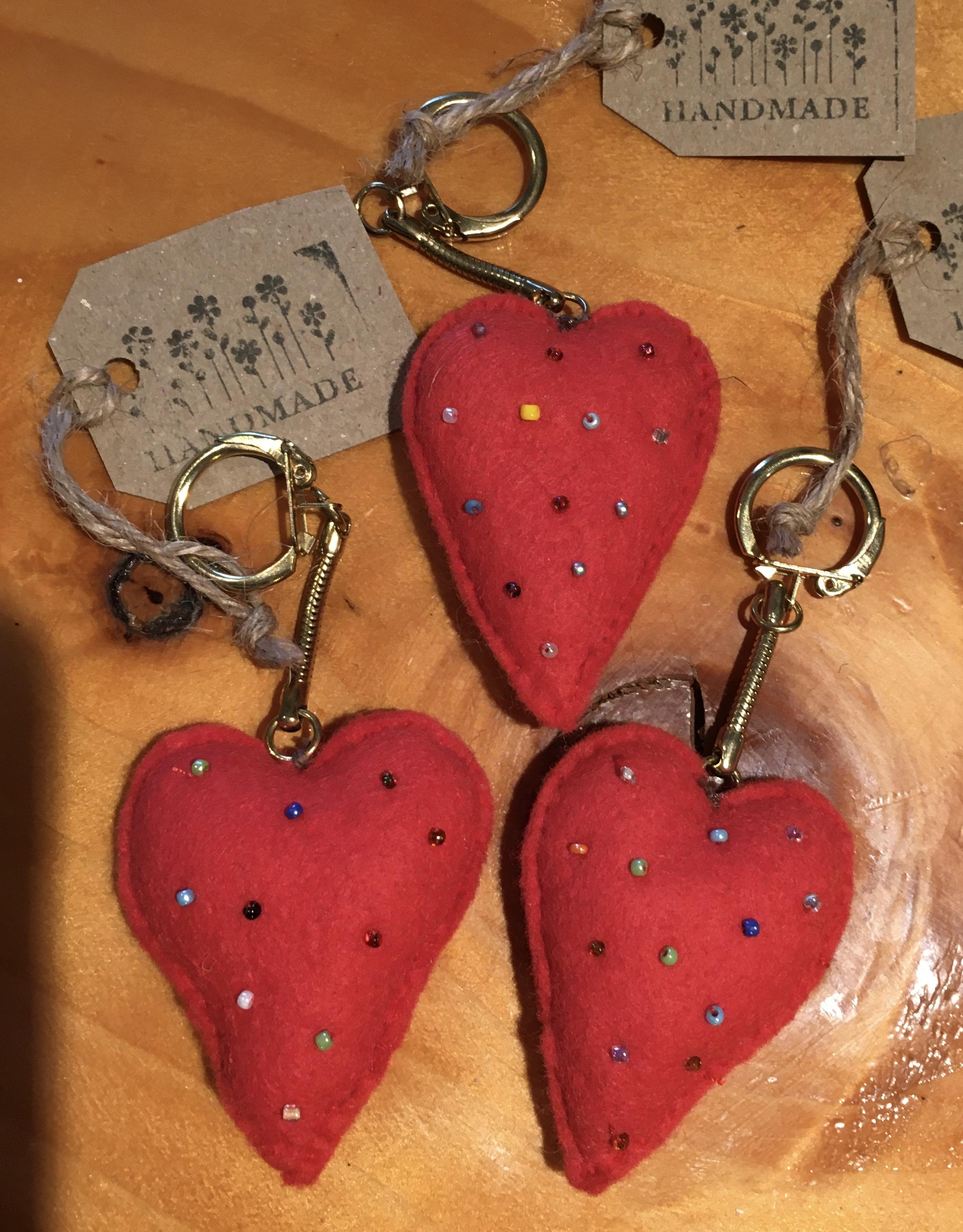 A sweet little hand stitched red felt heart keyring, adorned with seed beads, and filled with natural fibre. A sturdy metal key fob attached