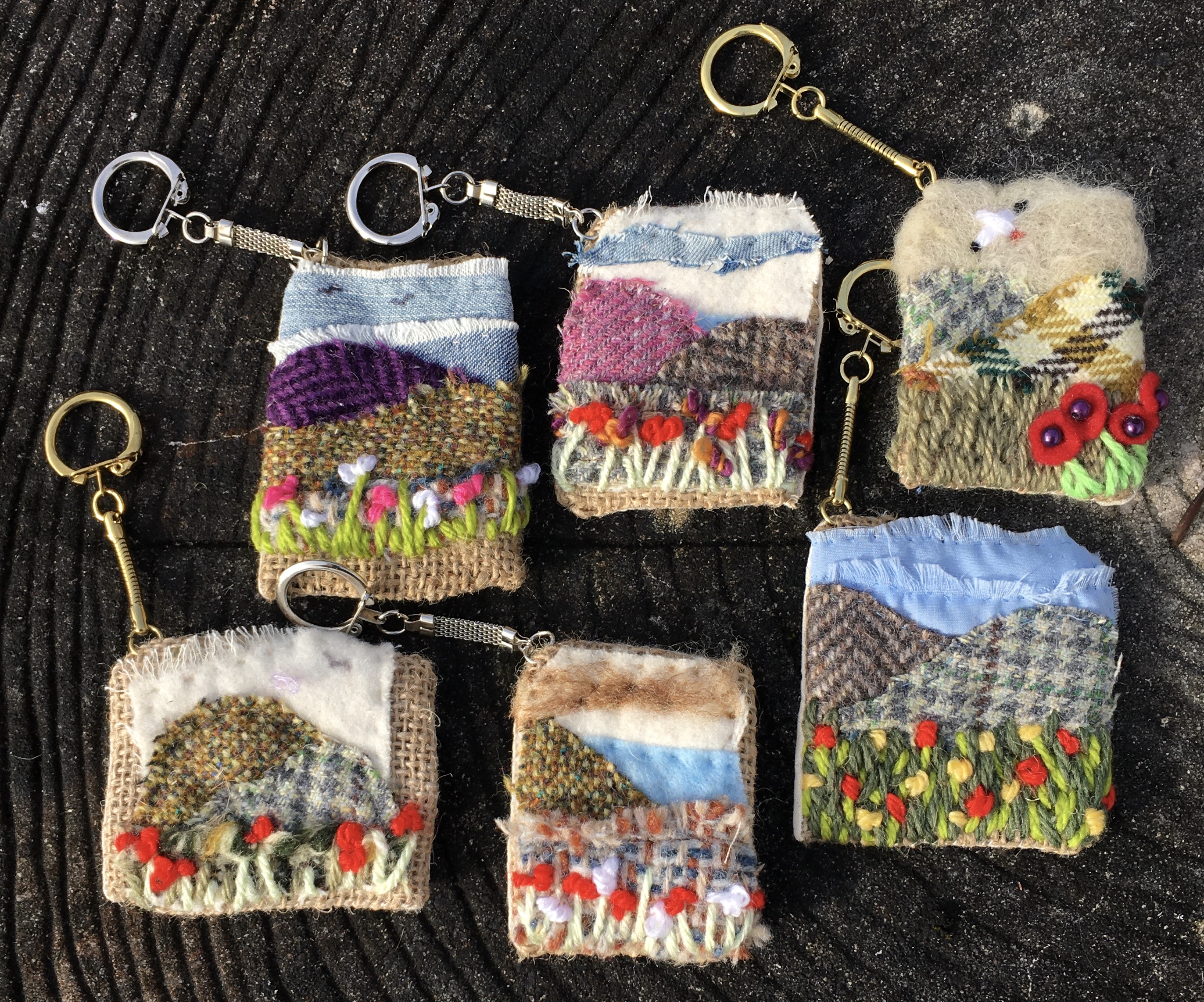 These keyrings are a lovely mini version of my "East Clare tapestries". Each one is completely unique, hand stitched using recycled materials.Backed with Calico....