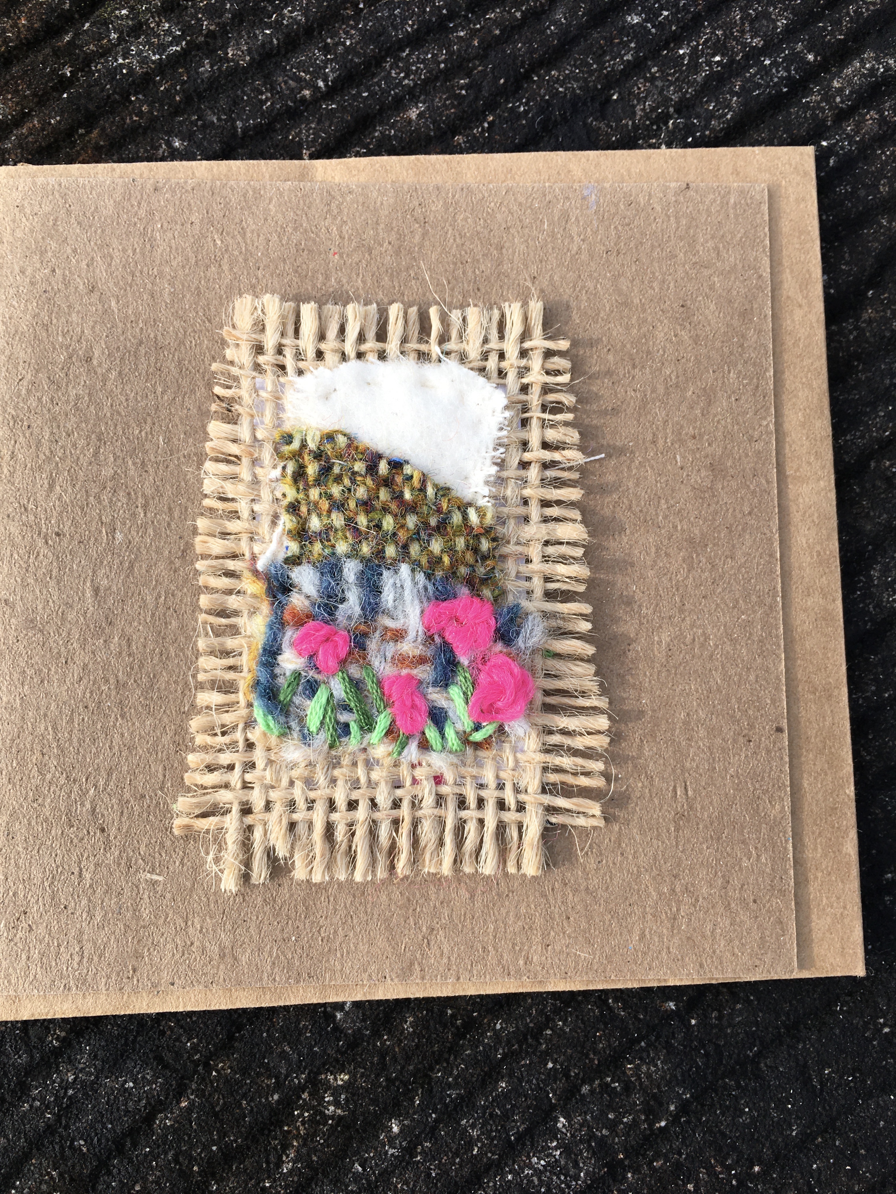 €3.50recycled card, using recycled fabrics, hand stitched, left blank inside for your message Dimensions: 4 in × 4 in × 0 inCards Leave this field blank