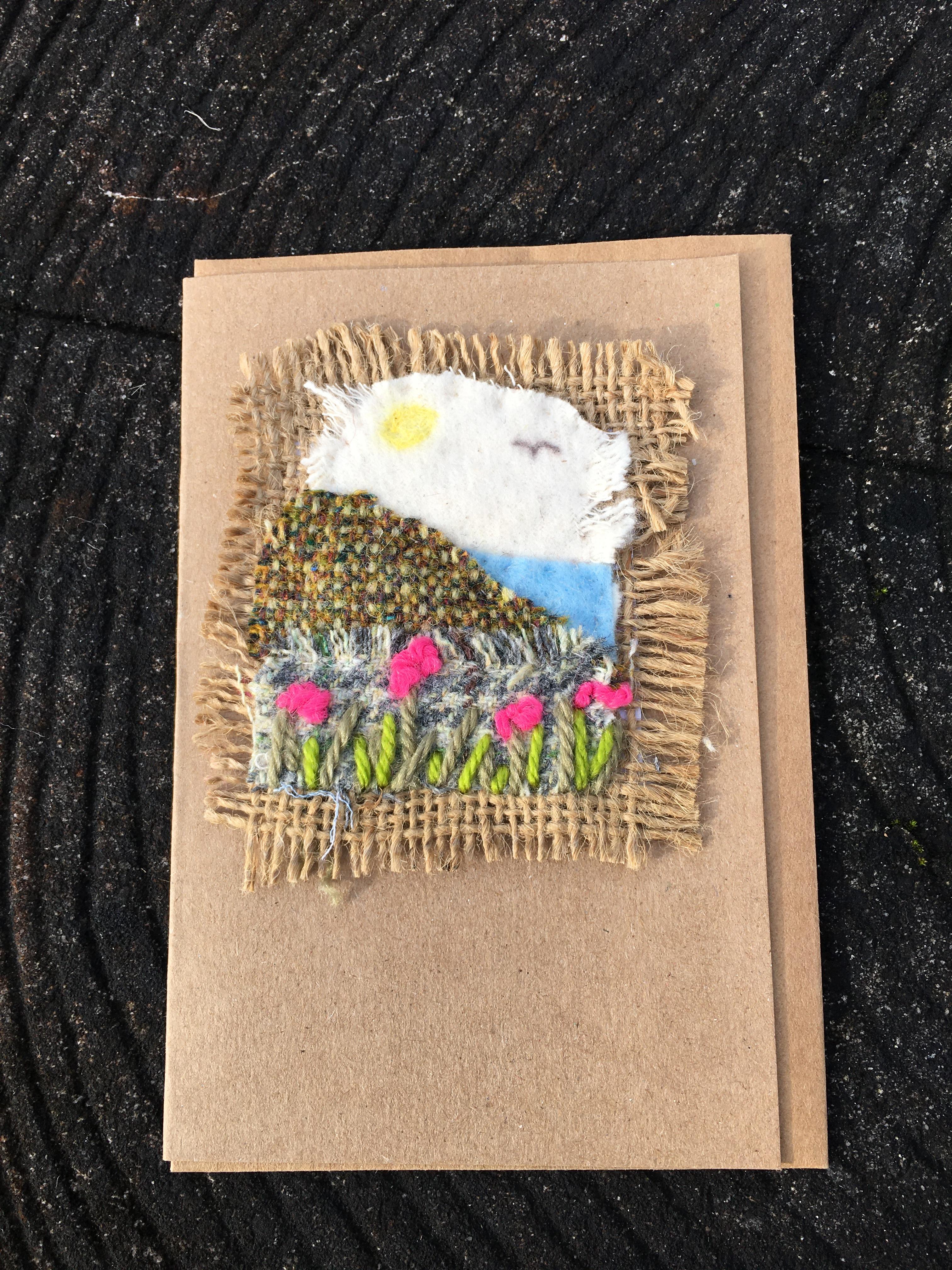 €4.50recycled card ,tapestry using recycled fabric, hand stitched. left blank inside Dimensions: 6 in × 4 in × 0 inCards Leave this field blank