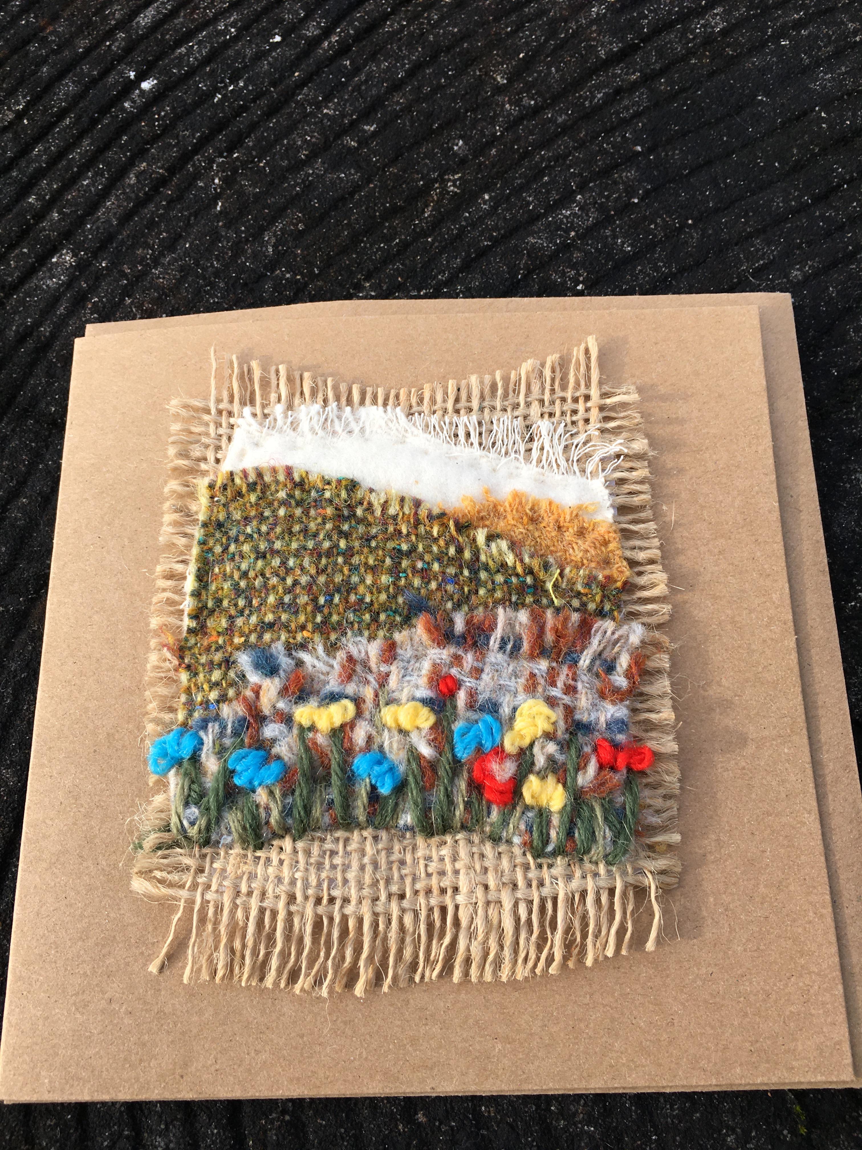 recycled card, tapestry using recycled fabrics, hand stitched. left blank inside