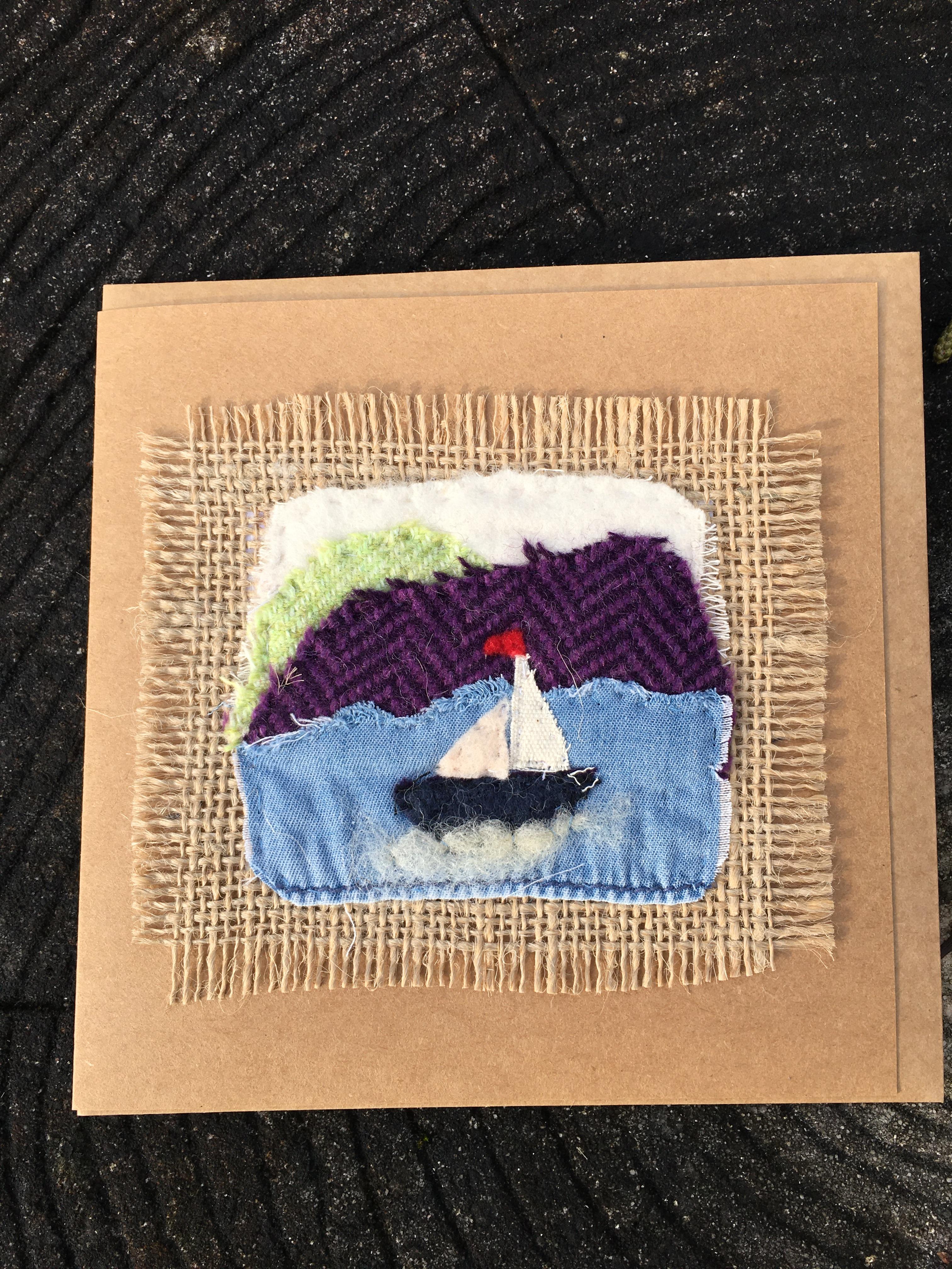 recycled card, tapestry using recycled fabrics, hand stitched. left blank inside