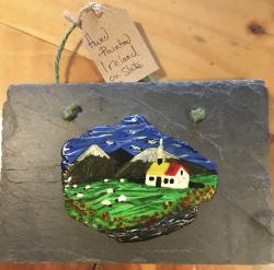 it has been hand painted on clay using acrylic paints and then mounted on natural slate, and varnished.