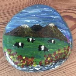 This sweet little pebble is has been hand painted with a scene from the "Burren" county Clare, Acrylics have been used, then yacht varnished to protect if the stone is put outside. I would suggest only putting outside for the warmer months.