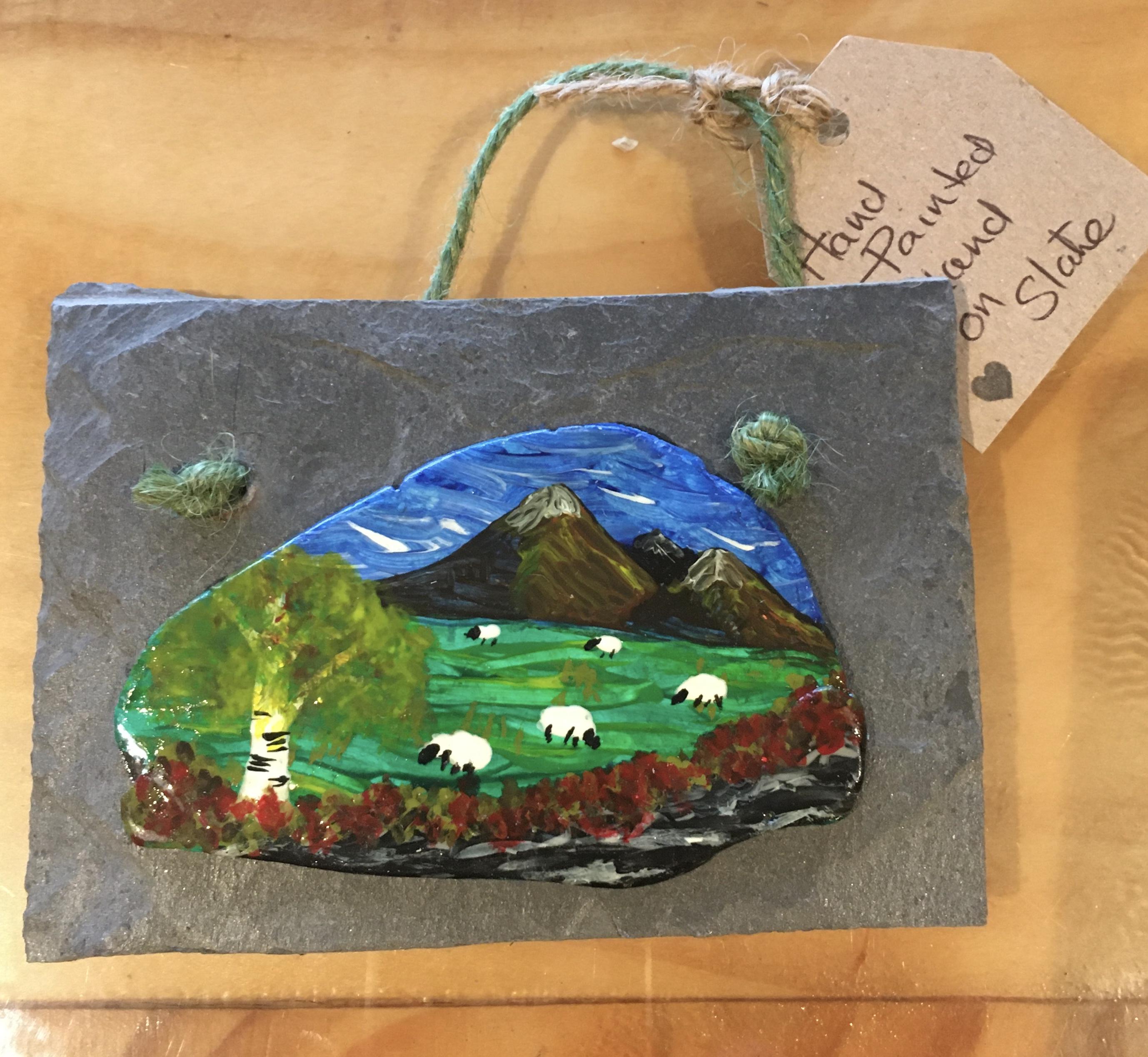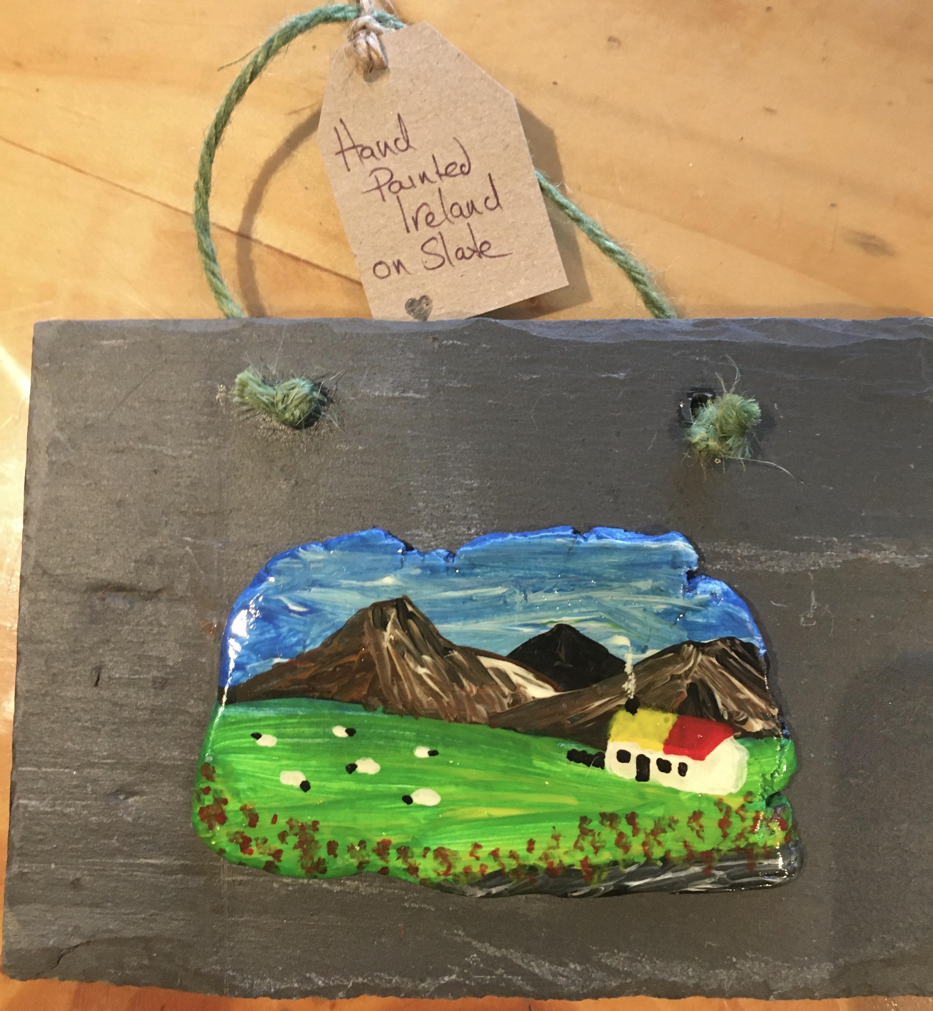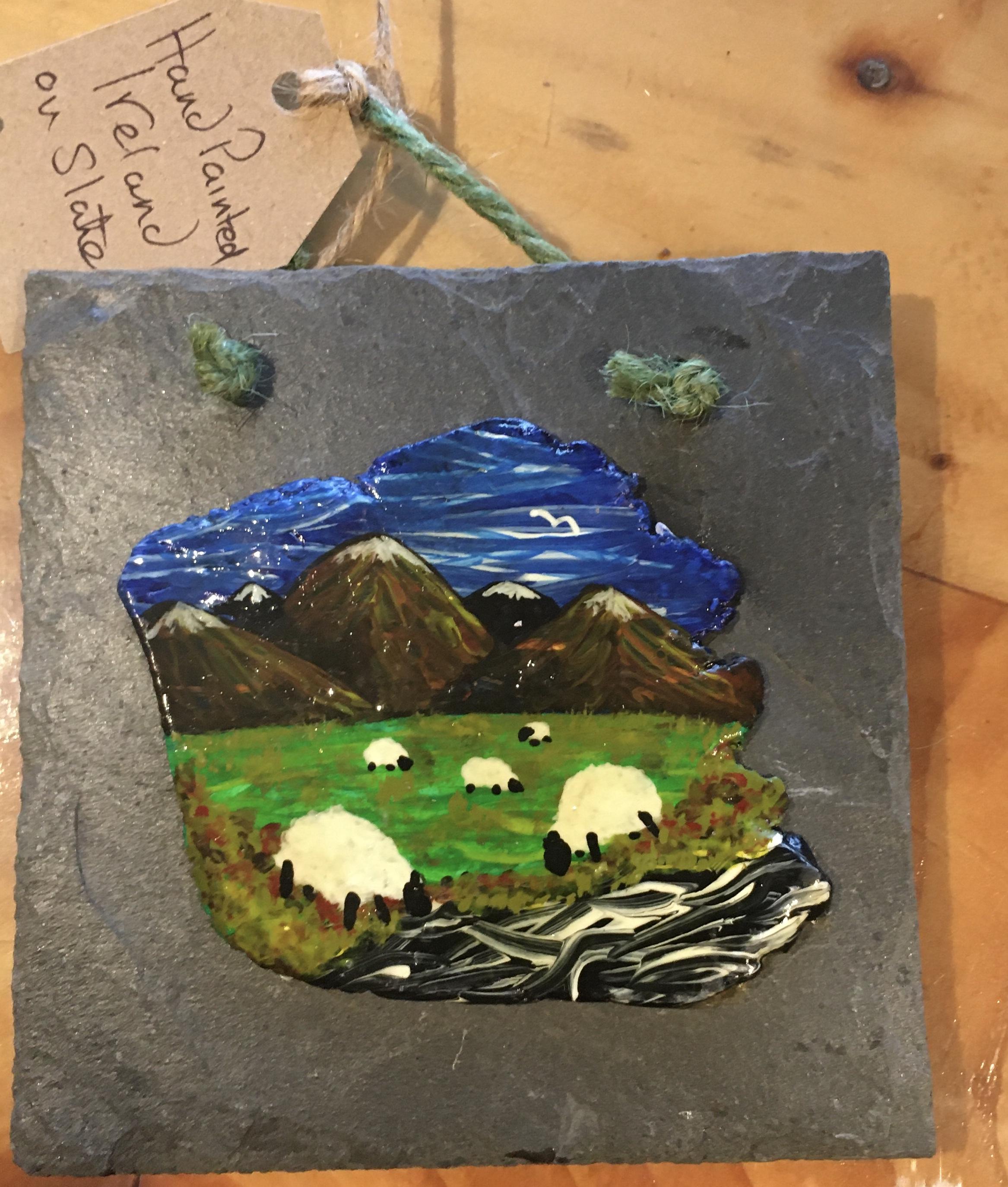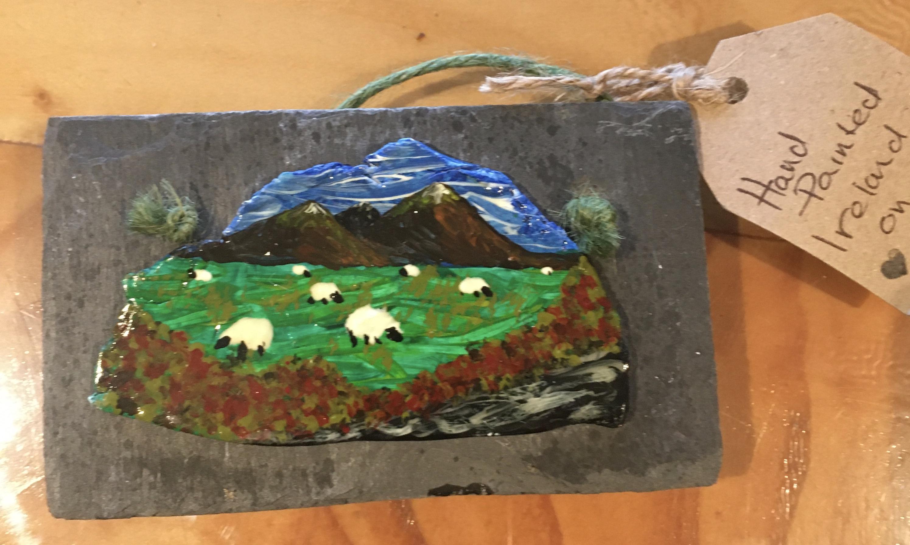 The scene depicted is from around the Burren county Clare...."Happy sheep in a beautiful place"...it has been painted on clay and then mounted on natural slate.