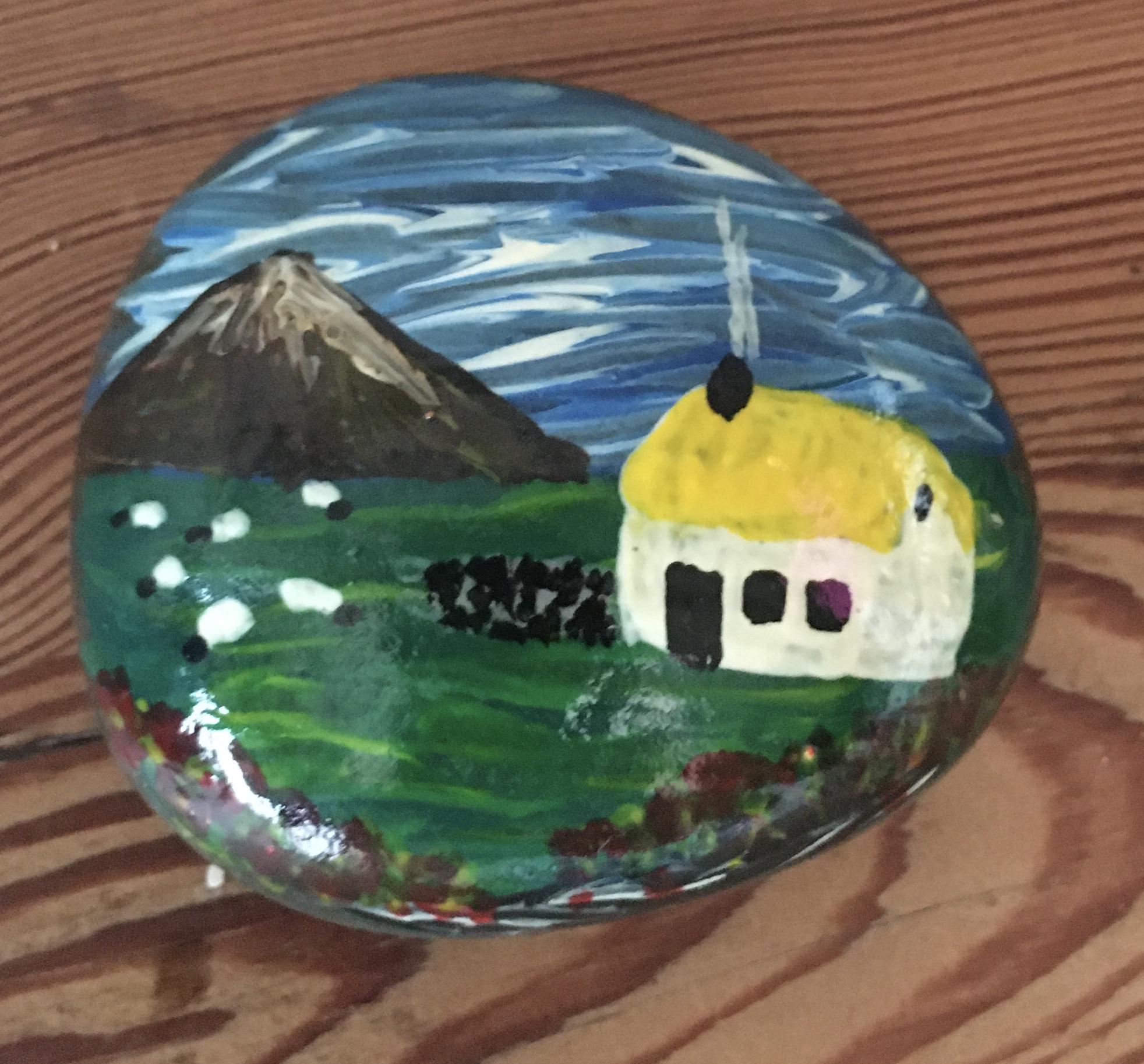 a sweet little pebble, hand painted using Acrylics, then varnished using yacht varnish, so it can go outside through the finer months of the year.