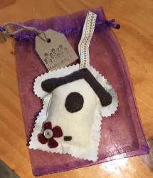 A sweet little wardrobe scenter, that could actually be hung anywhere, it has a fabric back, and a felt front, inside it has ample lavender that can be rejuvenated just by squeezing, there is a ribbon hanger, and it comes with it's own organza gift bag.