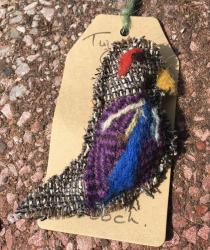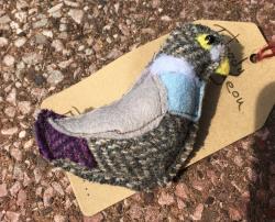 Ooh she’s lovely, little jenny wren, made from mixed tweeds and wools, hand stitched and adorned, she has a sturdy brooch pin on the reverse