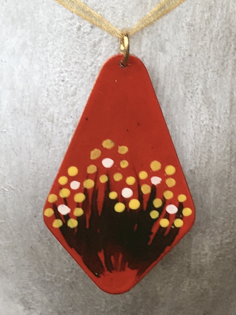 This lovely hand painted enamel on copper pendant is so pretty with it’s scarlet background and small yellow daisies.