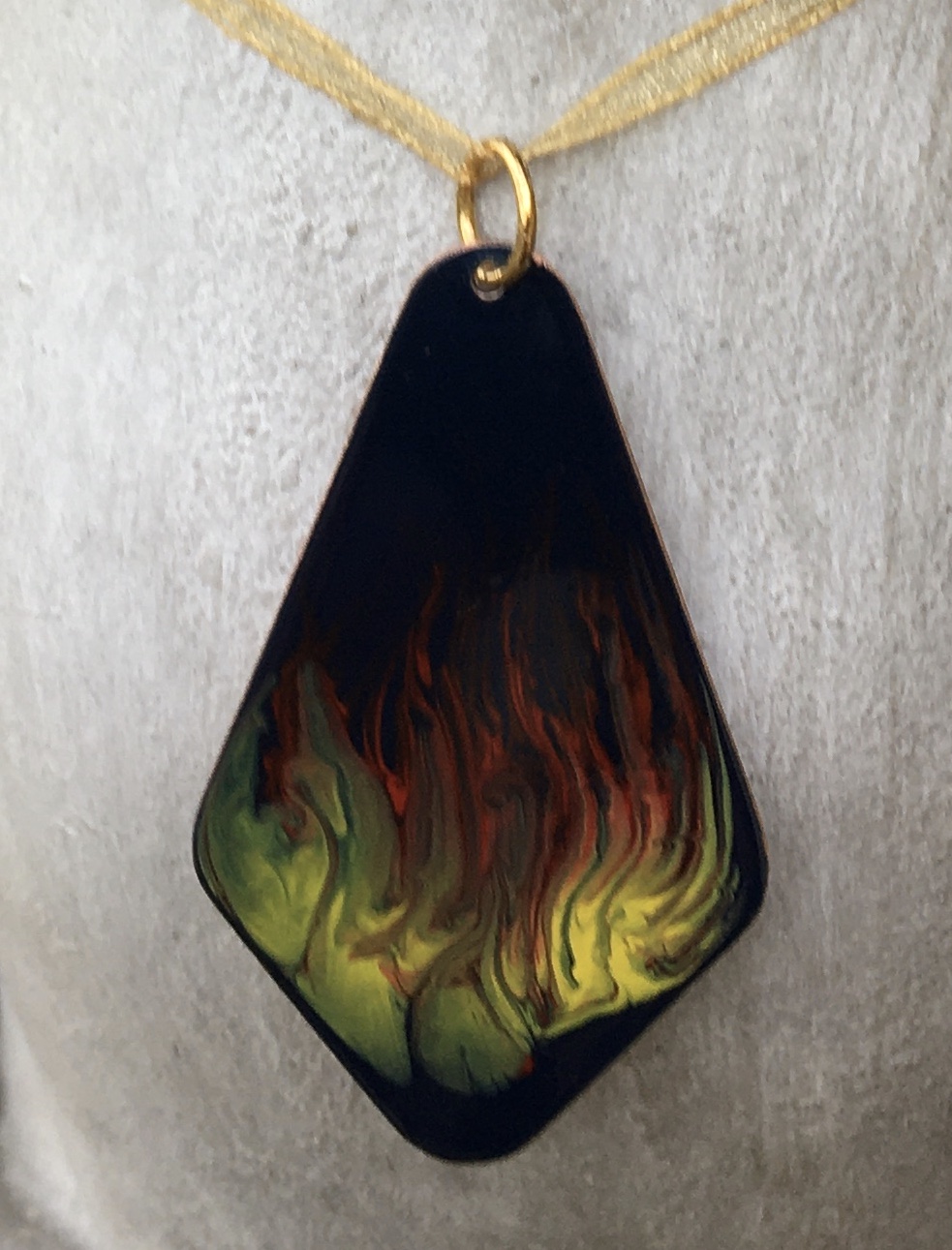 This stunning pendant is hand painted enamel on copper.