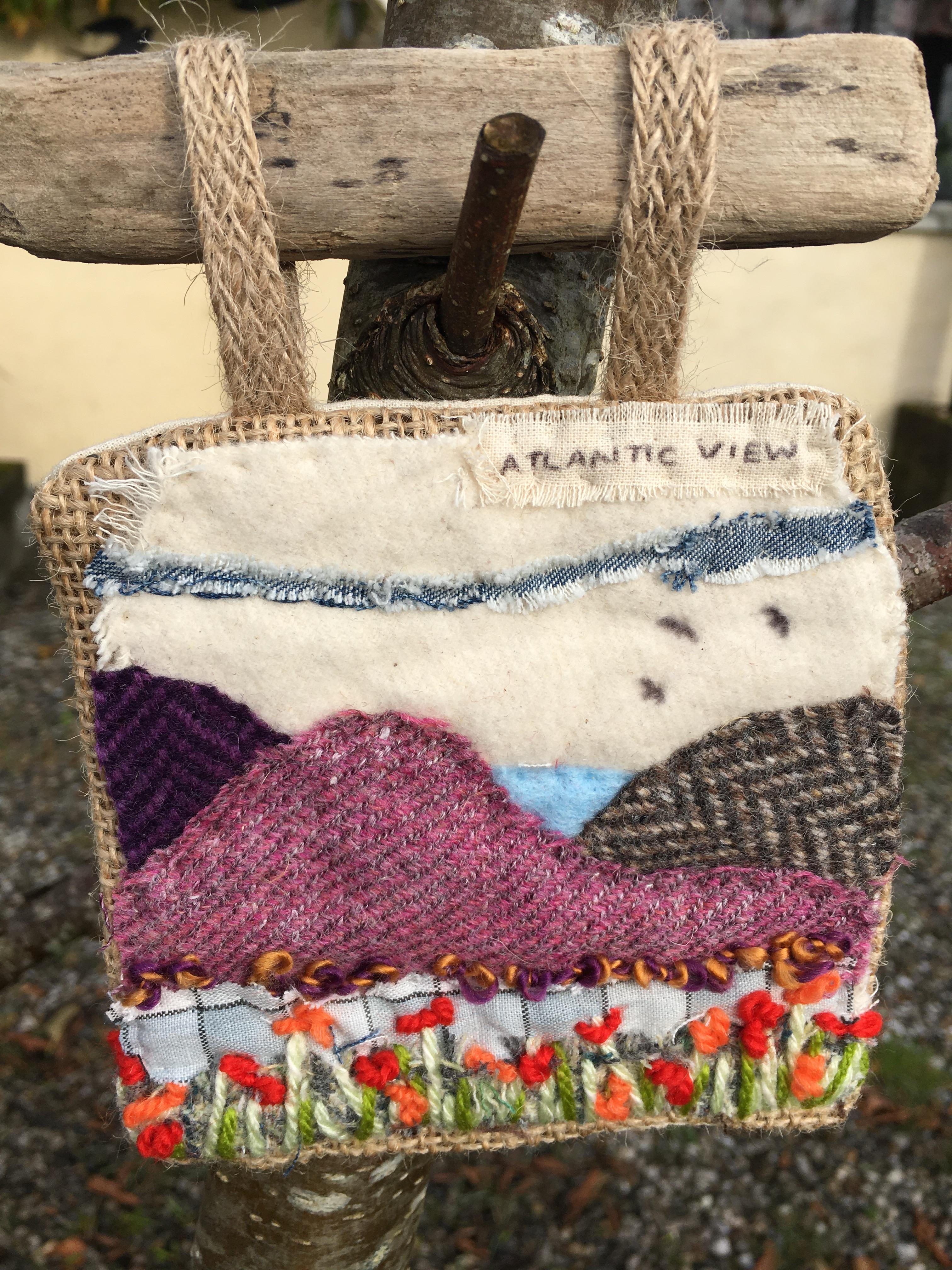 a smallish tapestry, created using recycled fabrics and wools, depicting a scene across the Burren to the sea.