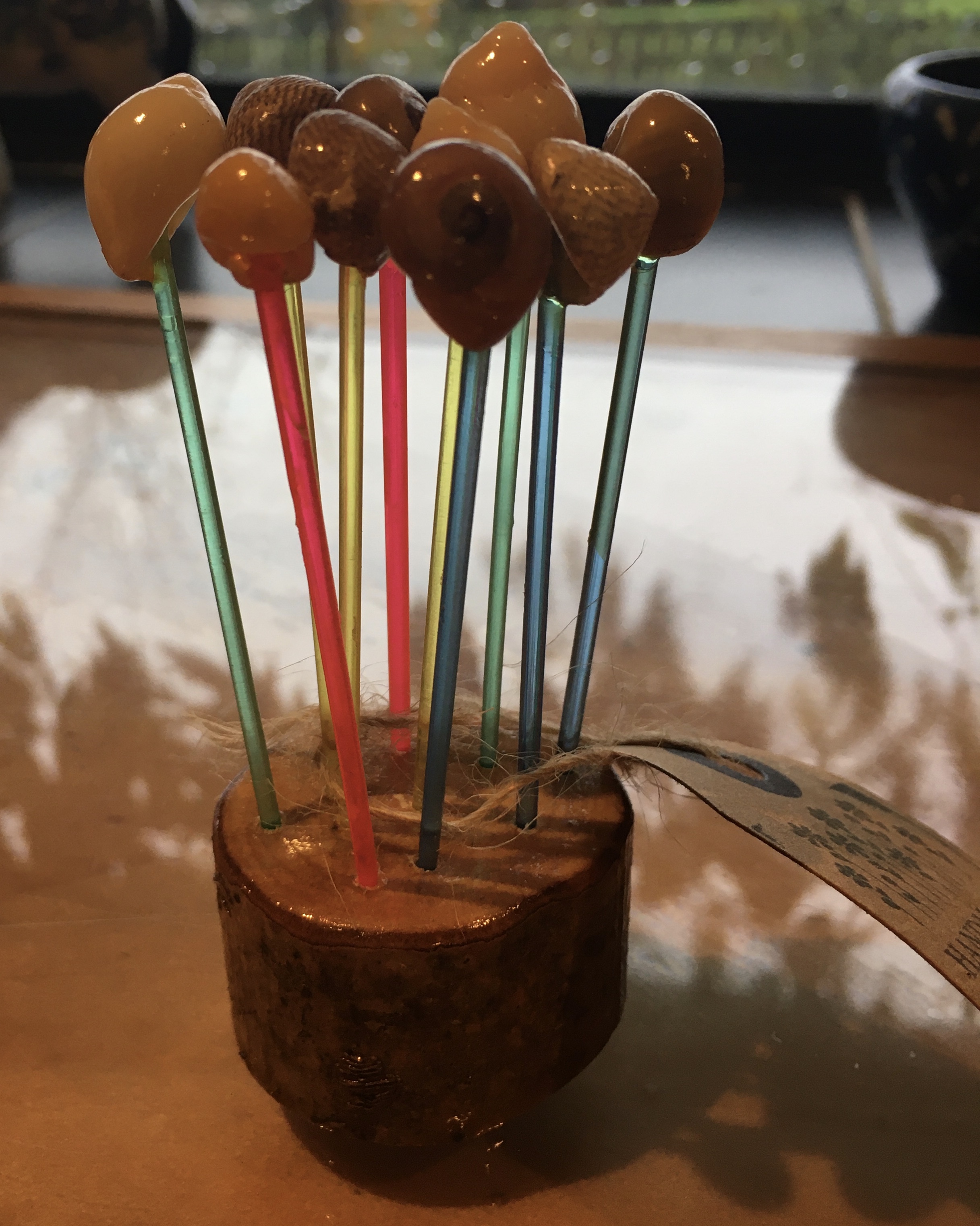 A sweet set of ten, real shell, topped cocktail sticks. They come with their own little wooden base.