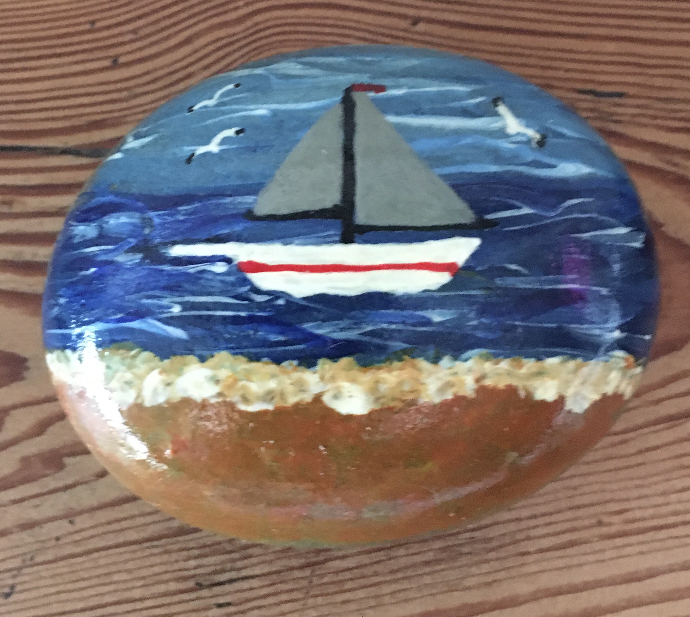 This sweet little pebble depicts a scene from "Kilkee" beach..it has been hand painted using Acrylics, then varnished with (Excuse the pun) "Yacht varnish"