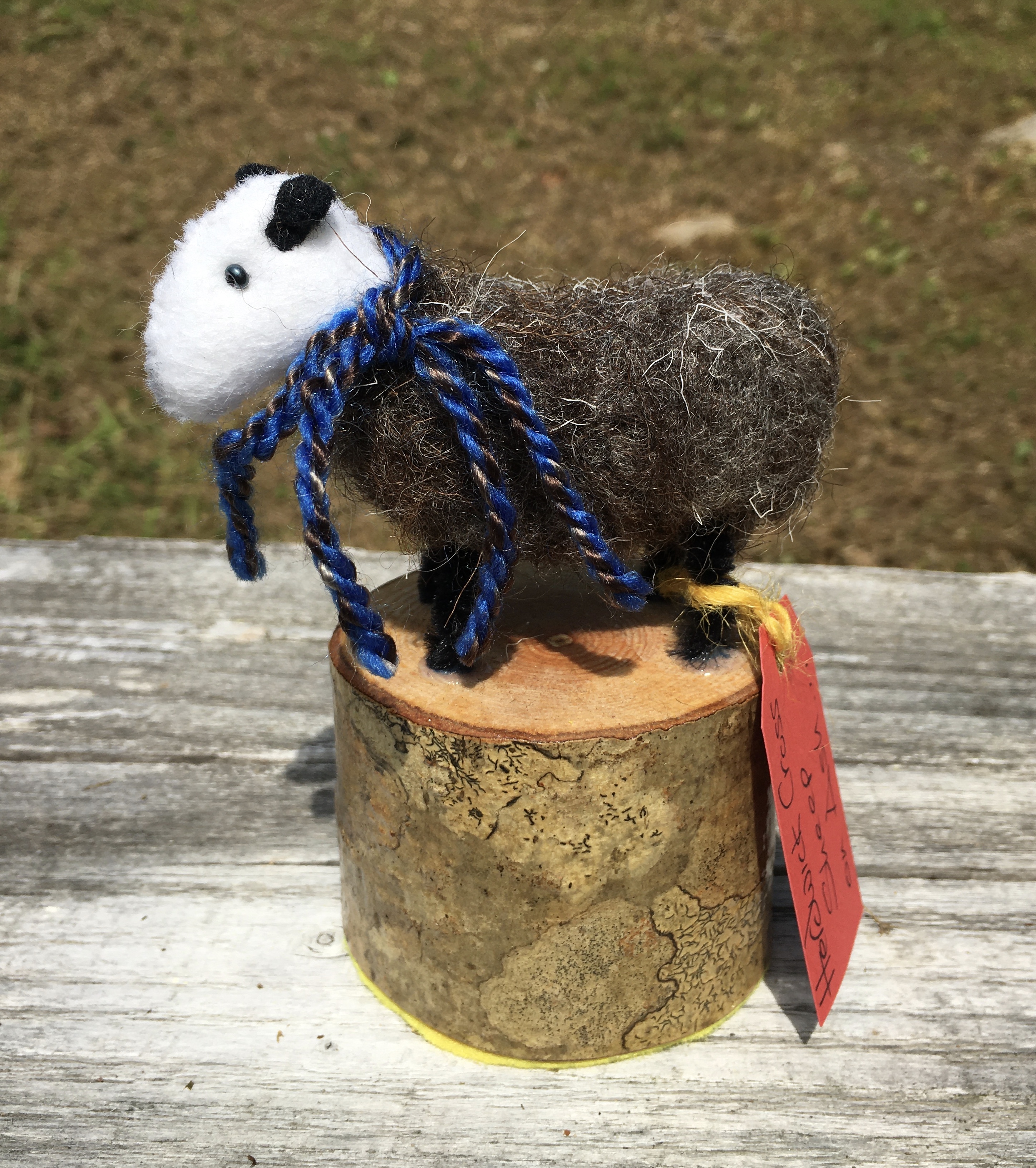 Well! Just look at her in a fancy blue scarf…this little Herdwick cross sheep is made from raw sheeps fleece and has been needle felted then hand stitched. then sits atop a lovely chunk of Ash wood that is varnished to bring out the stunning colours of the bark, she would grace any little corner