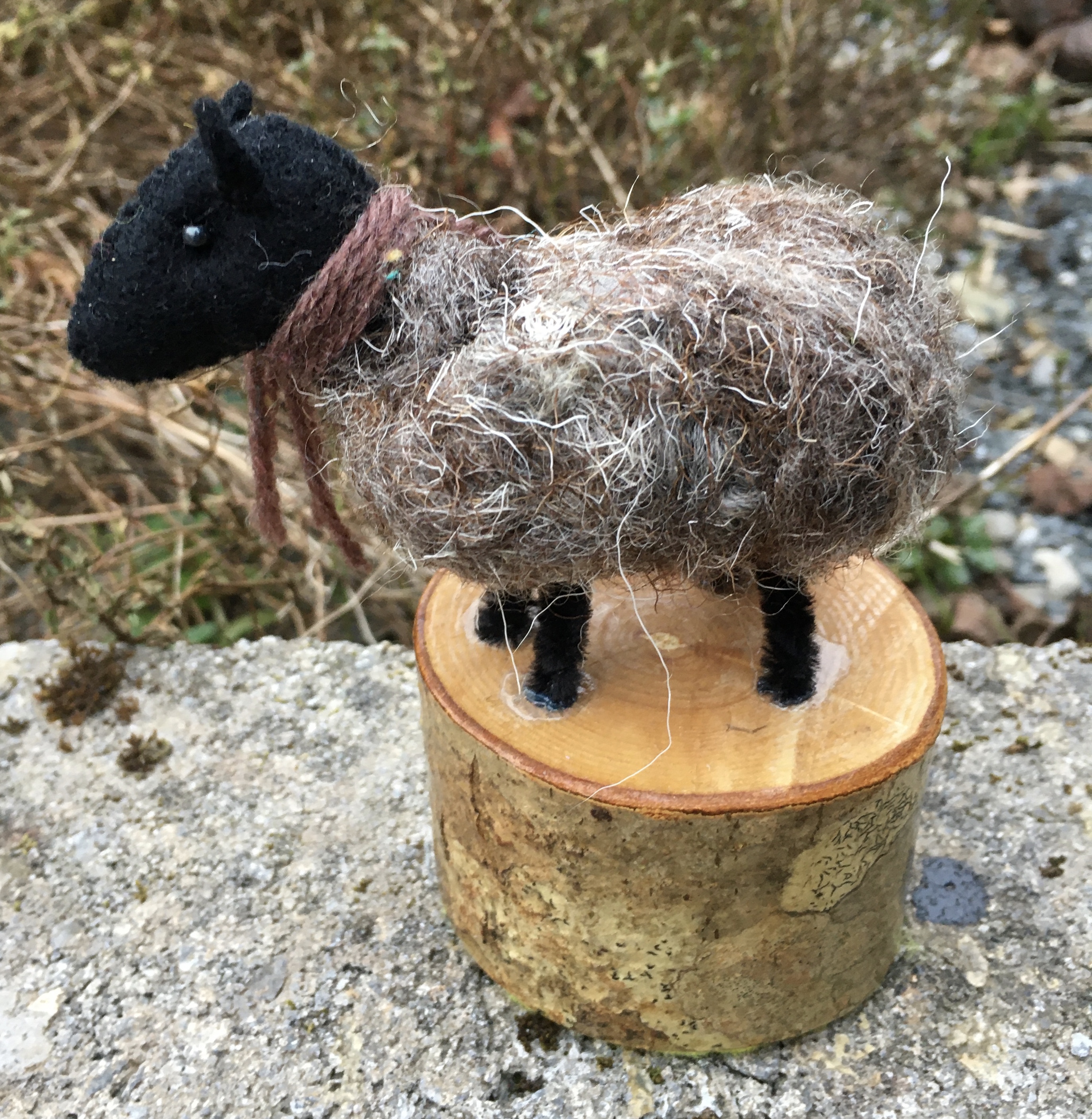 This lovelely Soay fleece sheep has been needlefelted then dressed in her pretty brown scarf. She stands on a lovely high varnished piece of Ash wood, handcrafted from start to finish, she would brighten any corner.